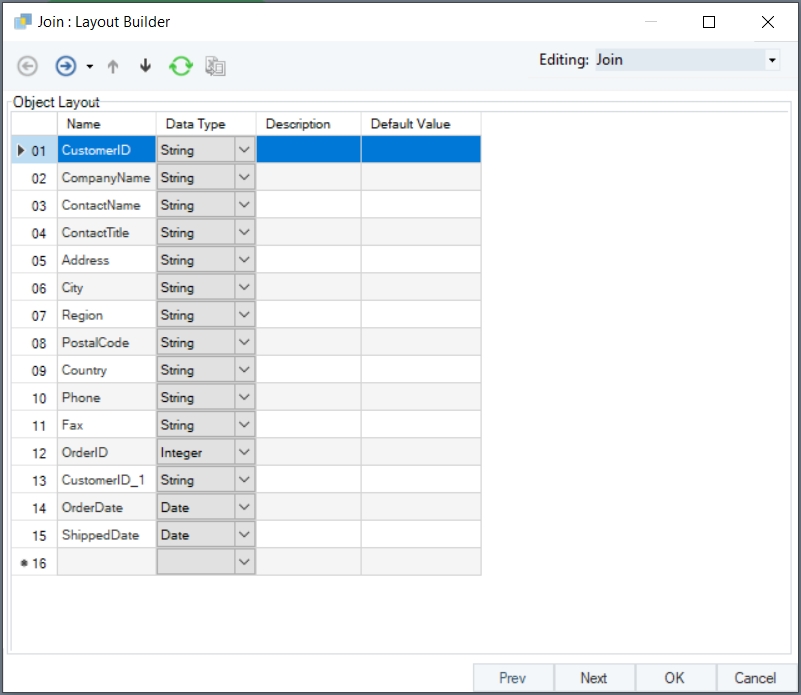 The first window is the Layout Builder window. You can manage the layout for your transformation (add or remove fields) from this window. Click Next to go to the next window.