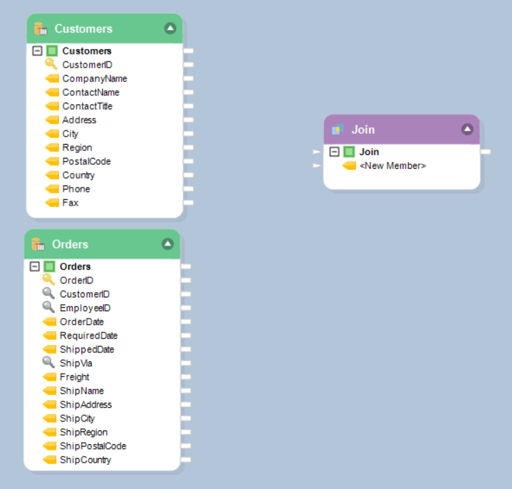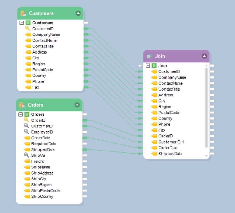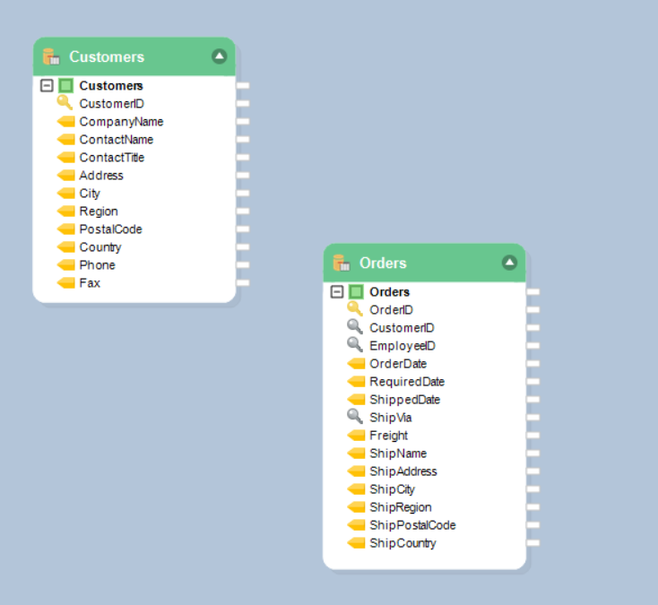 Suppose we have two database tables - Customers and Orders, as shown in the screenshot below, and we want to join these two tables.