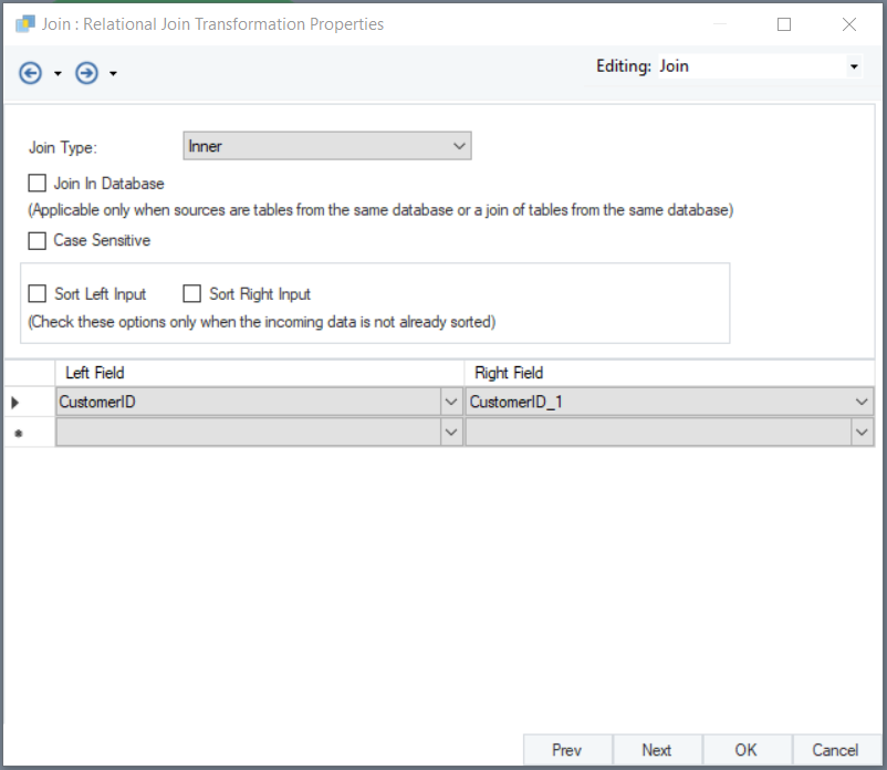 General Options window in Join Transformation: