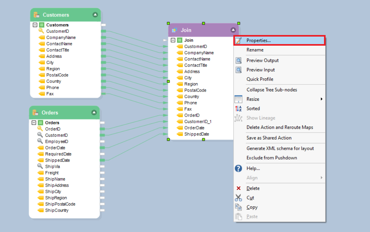 To set the properties for the Join transformation, double-click on the object or right-click and select Properties.