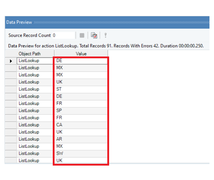 Now, if we preview the output, you can see that for each country name from the source table, the List Lookup has returned a corresponding code value.