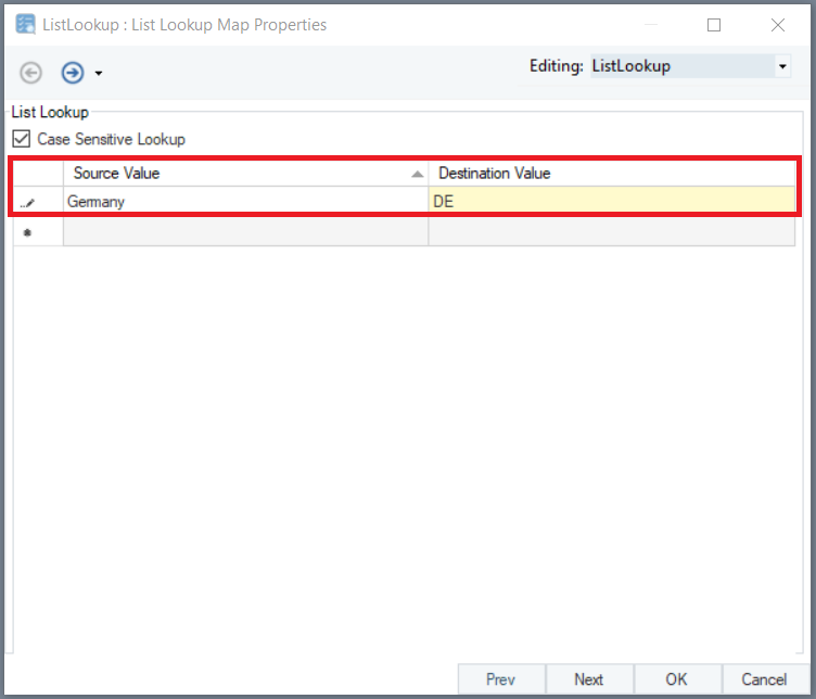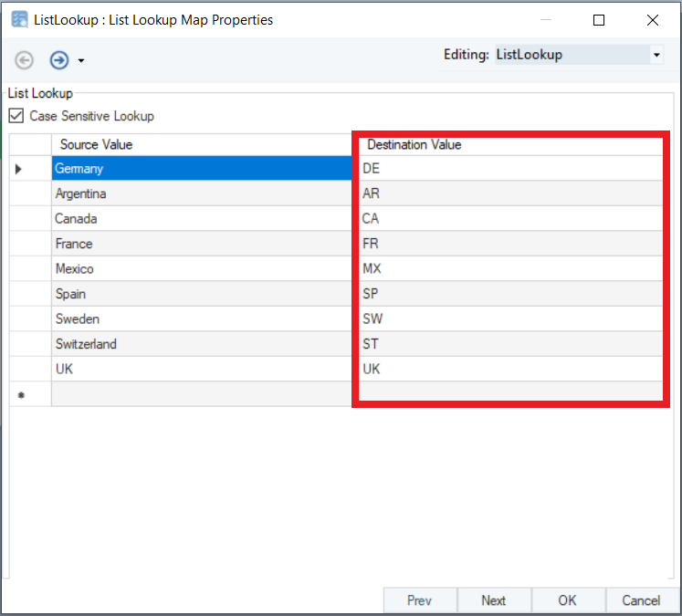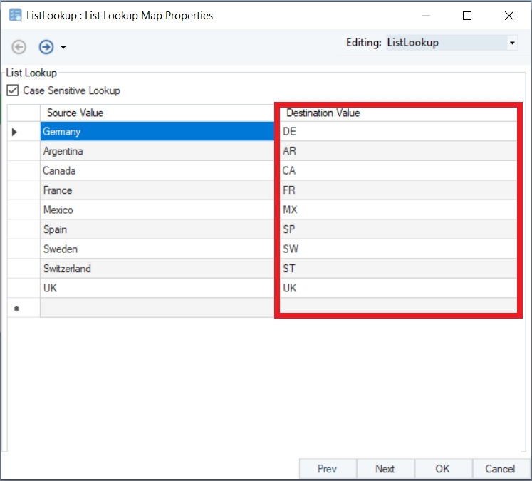 For example, if we write the Destination Value as ‘DE’, against the Source Value ‘Germany’, Centerprise will write ‘DE’ in place of ‘Germany’ in the output.