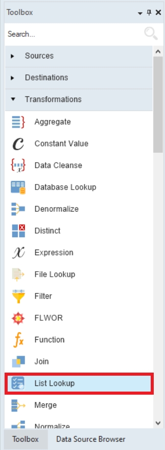 To start working, drag-and-drop the List Lookup object from Toolbox>Transformations>List Lookup.