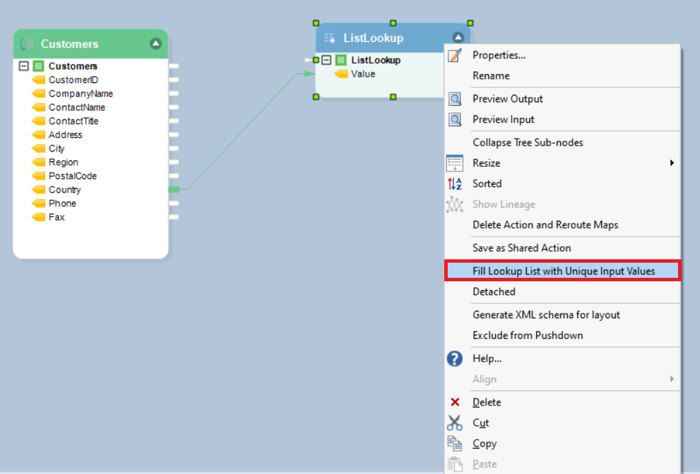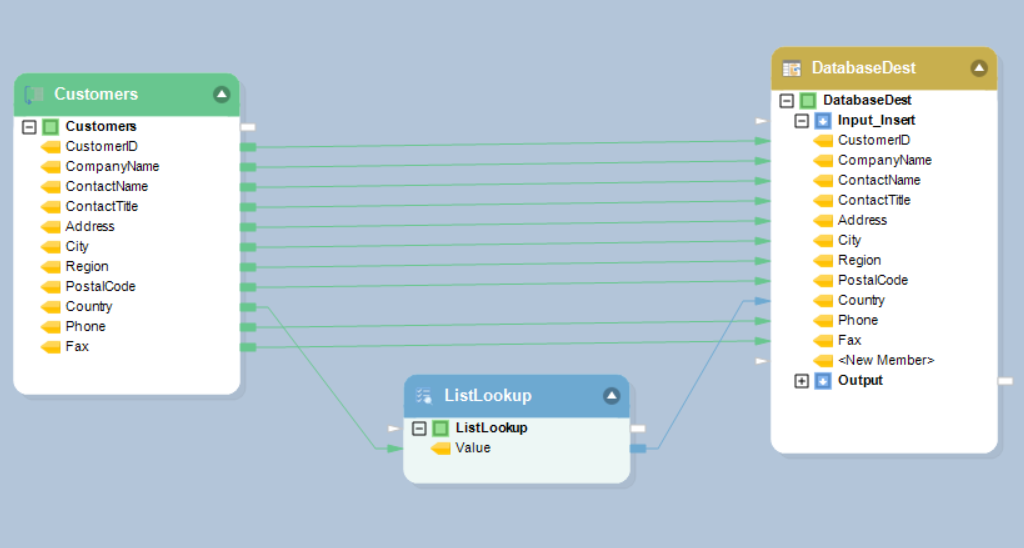 In this example, we are working with a Customers Fixed-Length File Source that contains customer information for a fictitious organization. The Customers data contains information about customers belonging to different countries. We want to convert the country names in this data into CountryCodes by using the List Lookup transformation object.