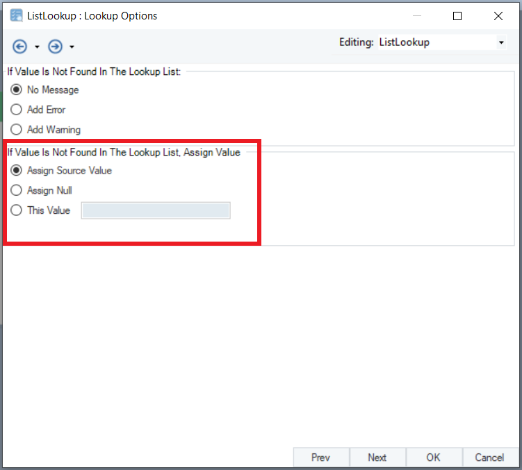 Additionally, when the value is not found in the lookup list, you can choose from the following options to assign it a value: