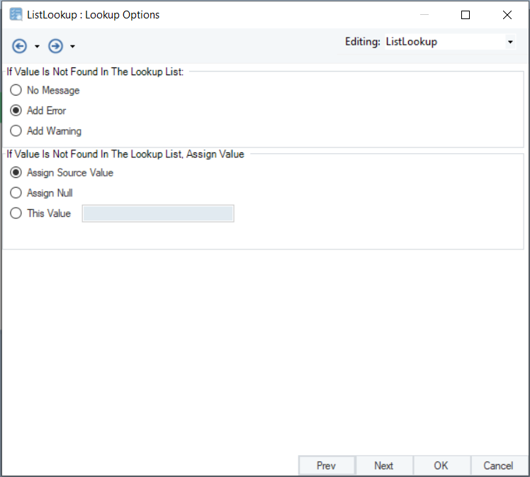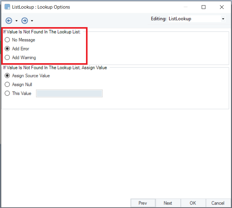 In this example, we will add an error and return the source value if the lookup value is not found. We will select the Add Error and Assign Source Value options. You can choose your preferred option and click *OK.