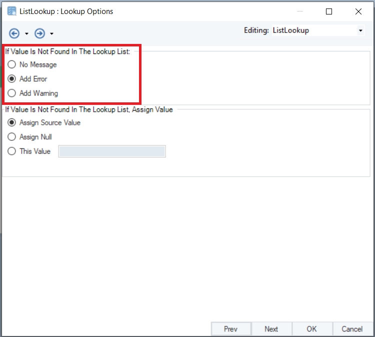 Add Error – The List Lookup table will trigger an error for the records that found no match in the lookup field
