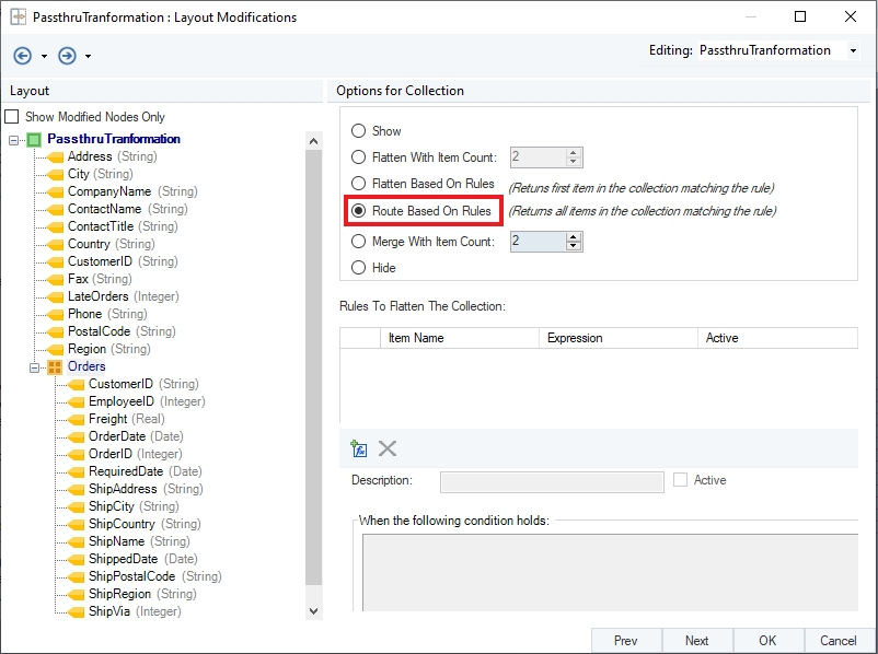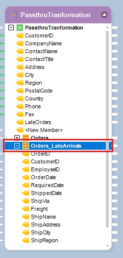 Click OK. Now observe that a new collection node, Orders_LateArrivals, has been added to the Passthru Transformation object.