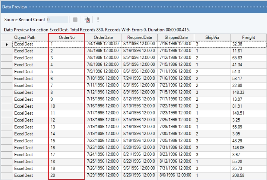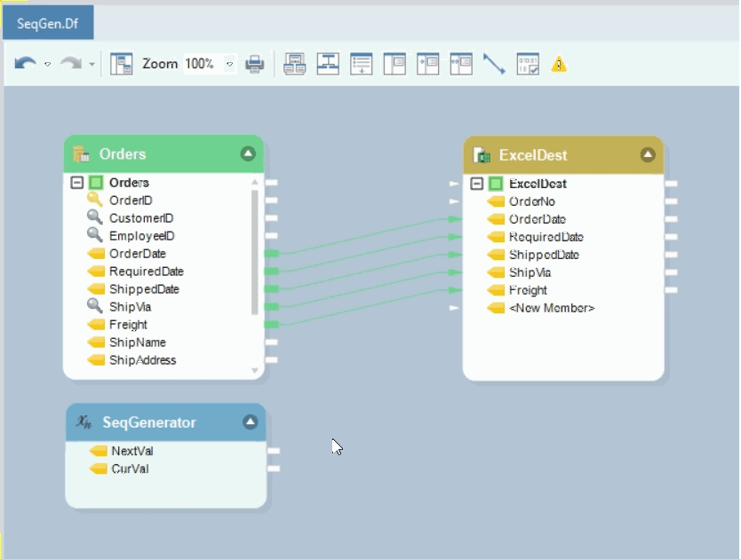 Here, we have retrieved data from the an Orders table using a Database Table Source object. We will use the Sequence Generator Transformation object to generate a sequence for the OrderNo field in our source data. Let’s see how this works.