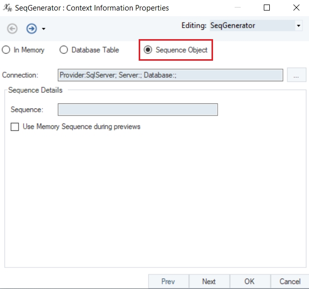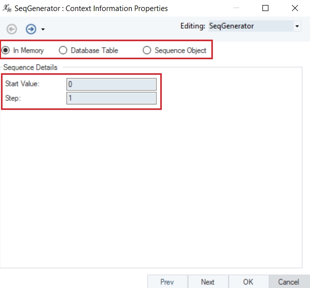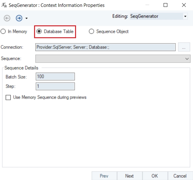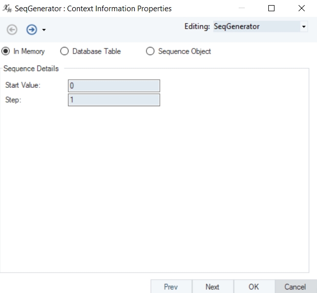 In Memory: The sequence will be created in memory at the dataflow run-time. The sequence always starts at the specified Start Value in the sequence properties.