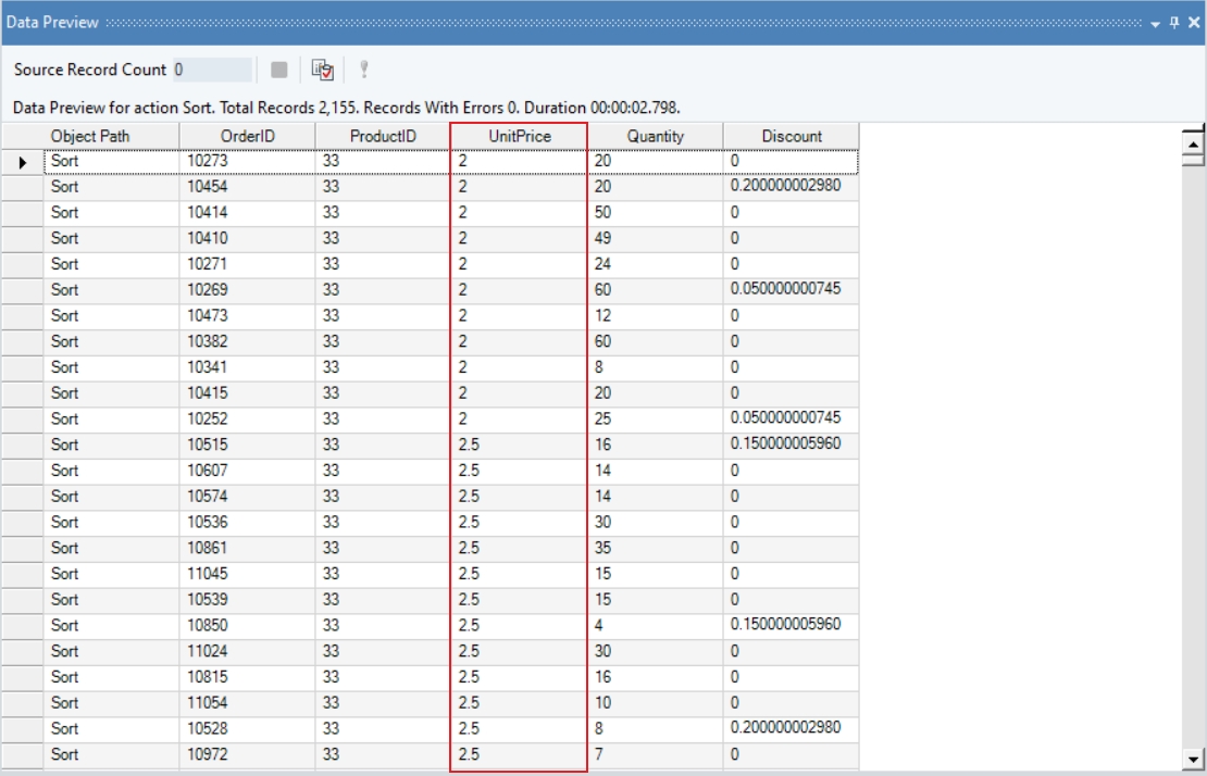 The output now shows the entire source data sorted in the ascending order of UnitPrice.
