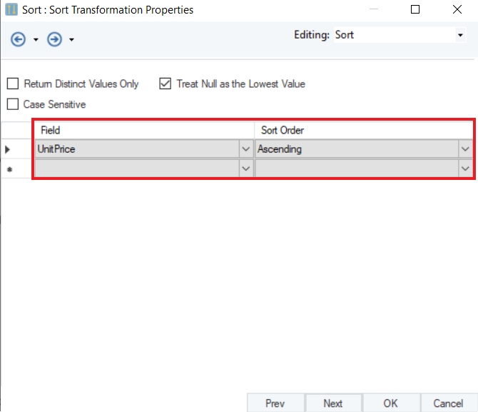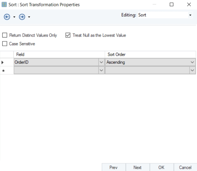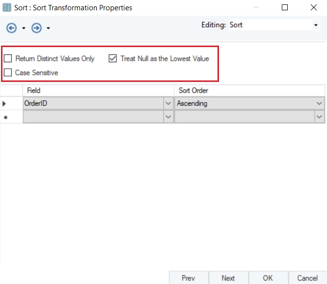 Treat Null as the Lowest Value: Check this option if you want a null value to be returned first in the ascending sort order, and conversely, have the null value returned last in the descending sort order.