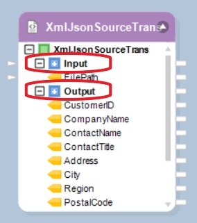 Output node: Once expand, you will be able to see the data fields that are in the XmlJson source file. You can map these fields to other objects in a dataflow through the output mapping ports.