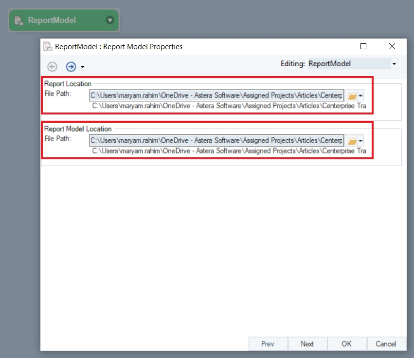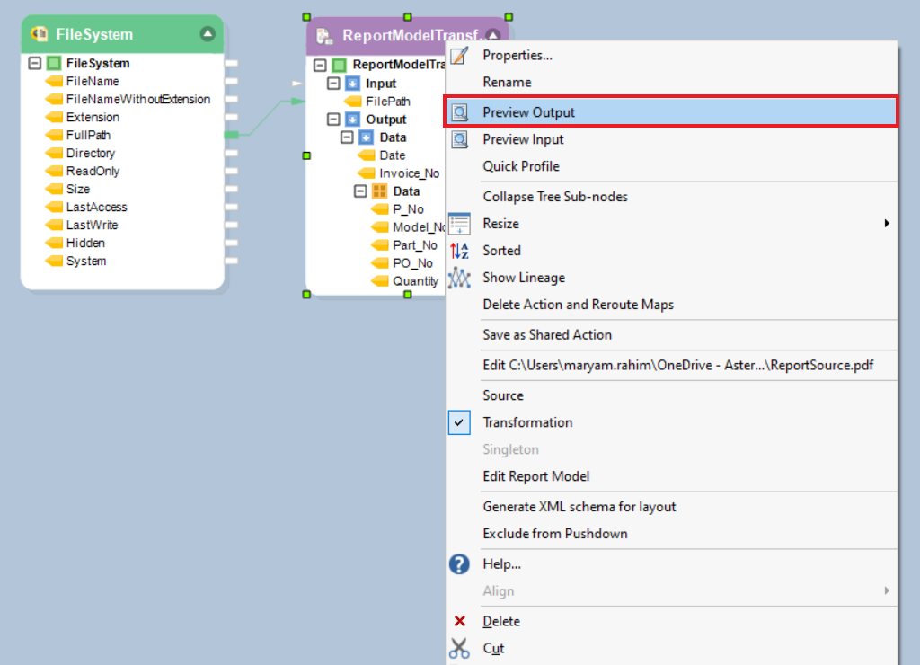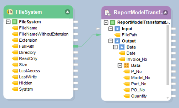 Map the FullPath field from FileSystem to the ReportModel object’s Input node (FilePath).