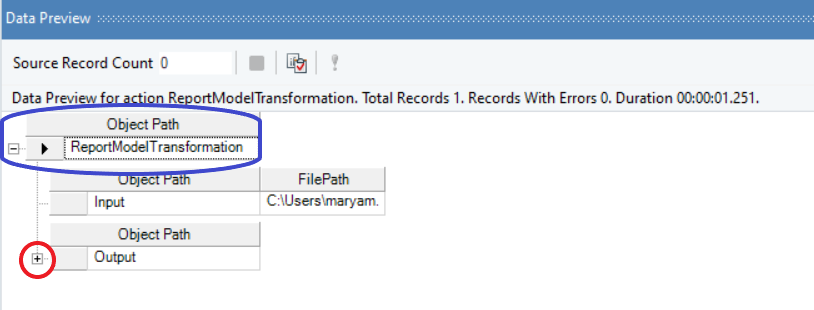 On selecting Preview output, you will be able to view the data in the Data Preview pane. The data that you see in the above image is in its condensed form. To expand the data and preview your output, you need to click on the +icon right next to the root node – ReportModelTran. And then to further expand the data, click on the +icon right next to the sub node – Output.