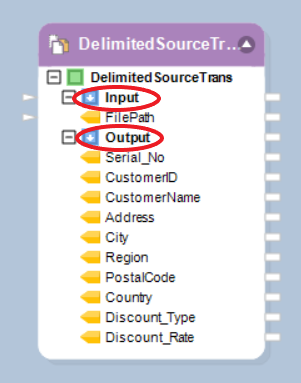 Output node: On expanding the Output node, you will see the data fields in the delimited source file. Map these fields to other objects in a dataflow through the output mapping ports.