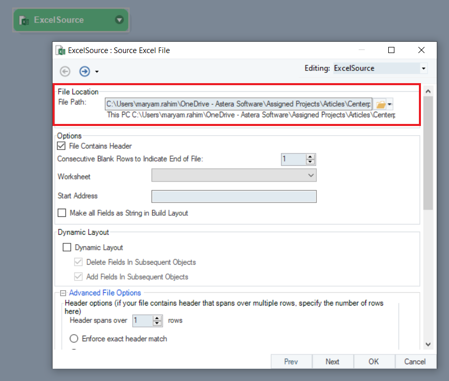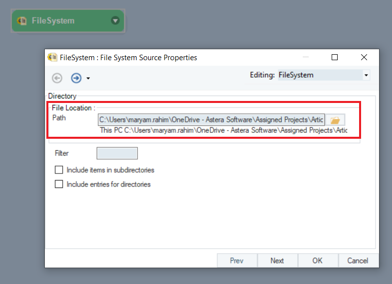 In the File System Source Properties, provide the path of the directory and folder where the excel files are located.