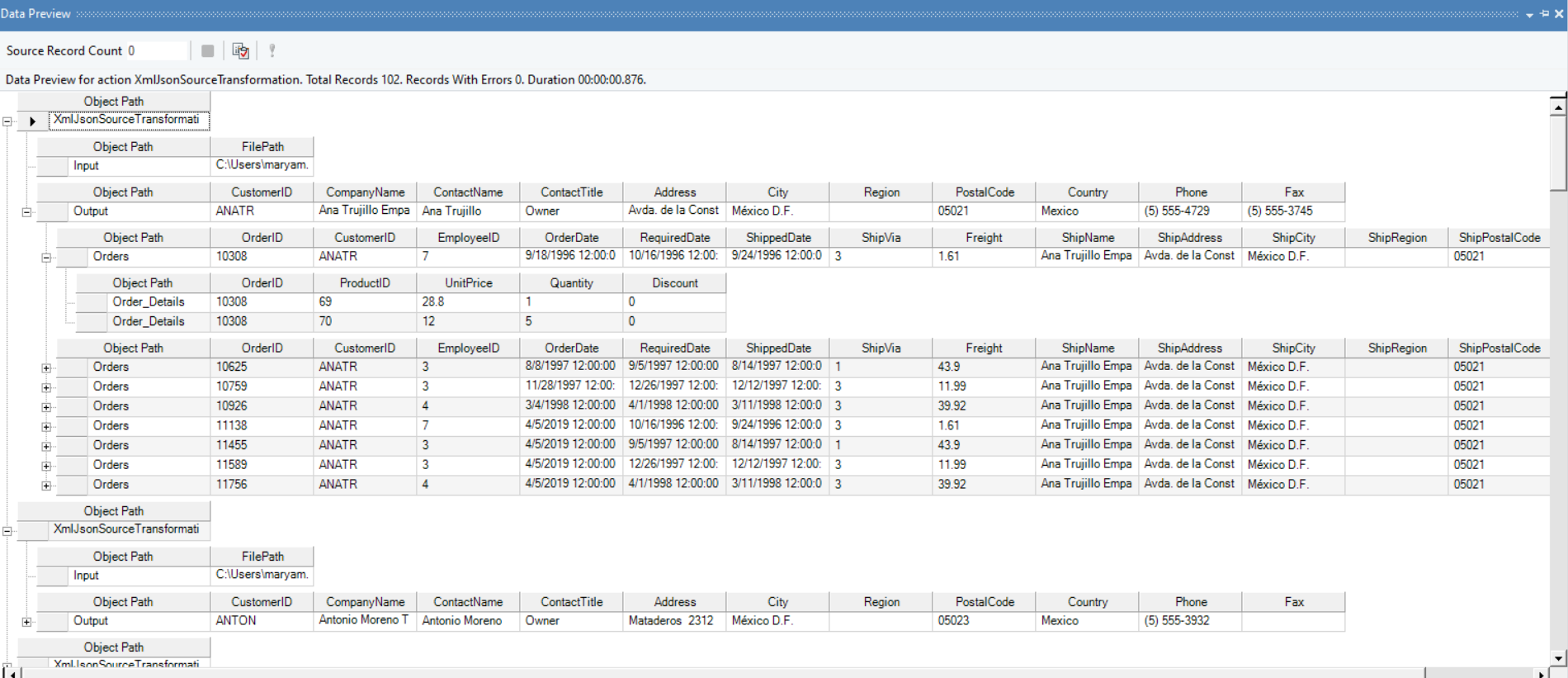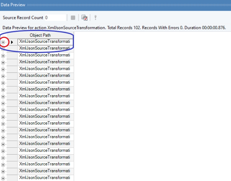 Now our XmlJson source transformation object is ready. To preview the data, right-click on the XmlJsonSourceTrans object and select Preview Output.