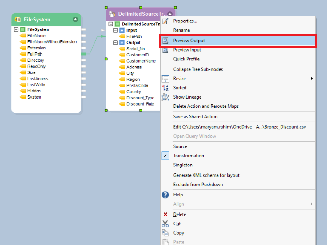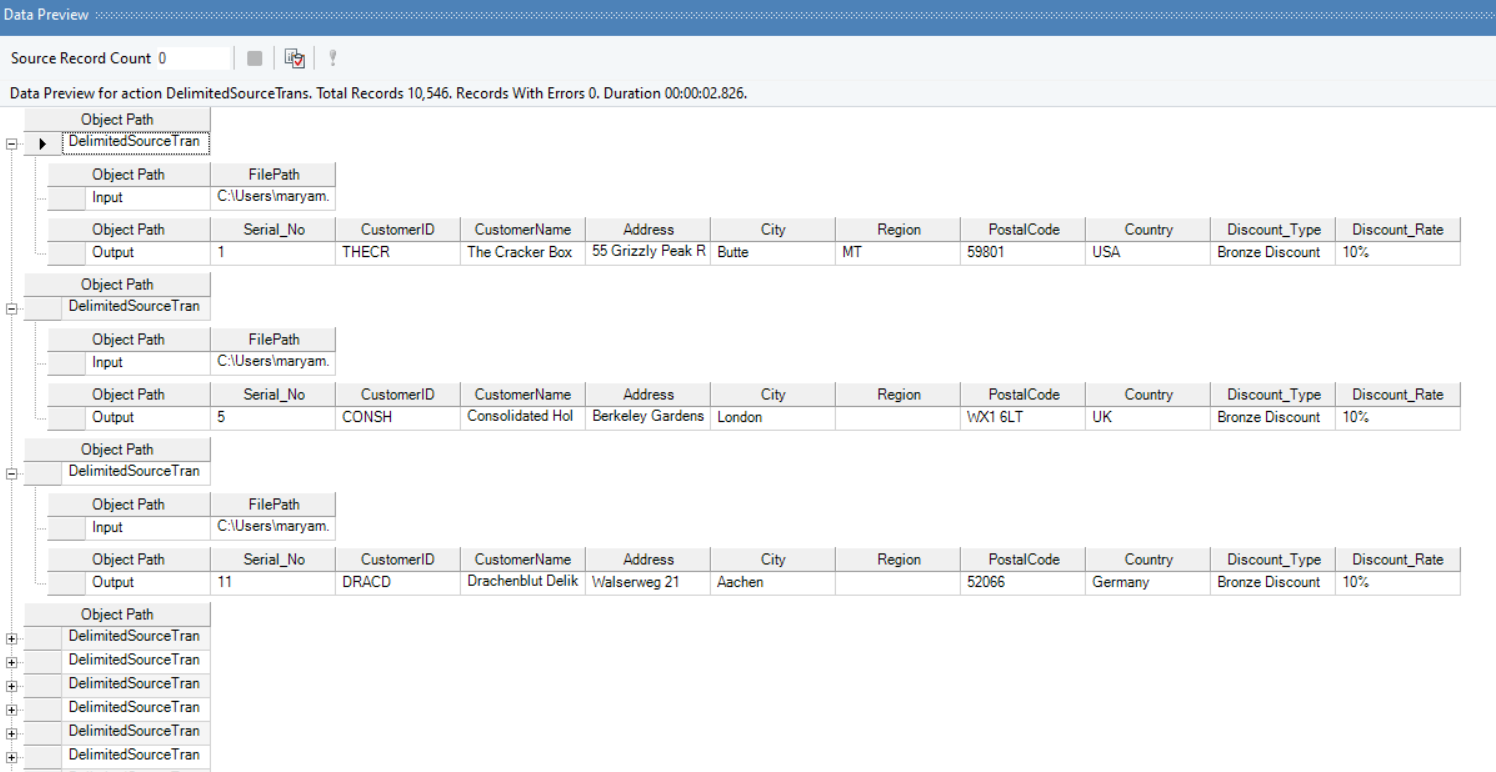 Now our Delimited Source Transformation object is ready. To preview the data, right-click on the DelimitedSourceTrans object and select Preview Output.