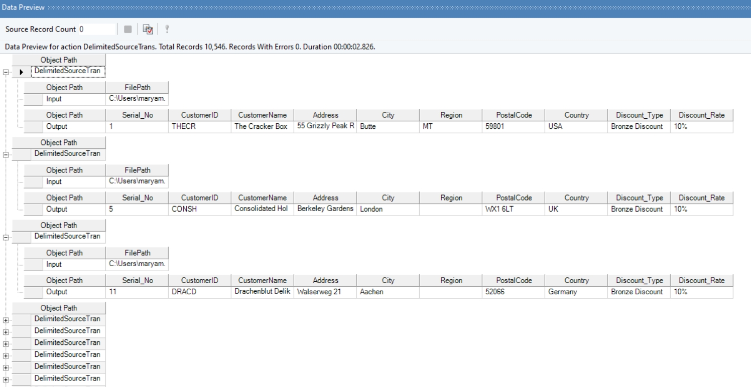 Once you select Preview output, you will be able to view the data in the Data Preview pane. The data that you see in the above image is in its condensed preview format. Click on the +icon right next to the root node of theDelimitedSourceTran object to expand the node and preview your data.