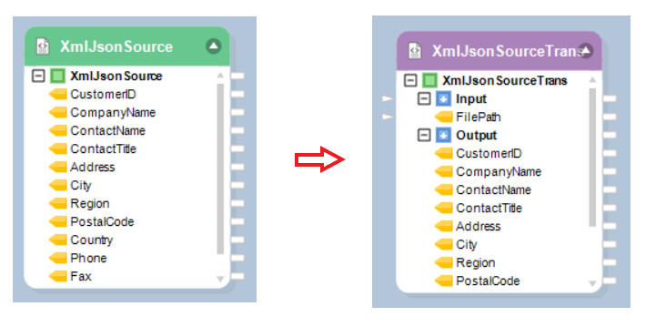 The header of the XmlJsonSource object will change to purple indicating the conversion from a source object to a transformation object.