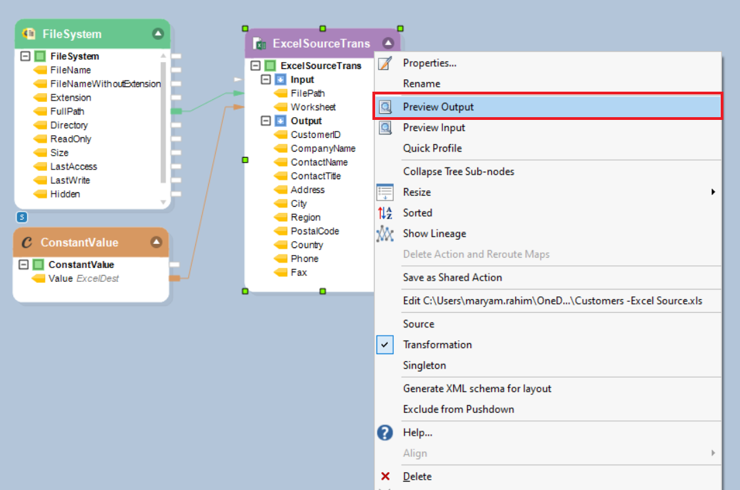 Map the FullPath field from FileSystem to the ExcelSource object’s Input node (FilePath).
