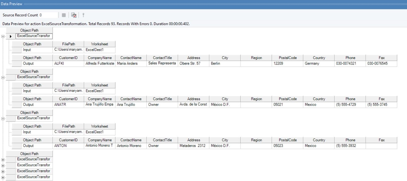 Now our Excel Source transformation object is ready. To preview the data, right-click on the ExcelSourceTrans object and select Preview Output.