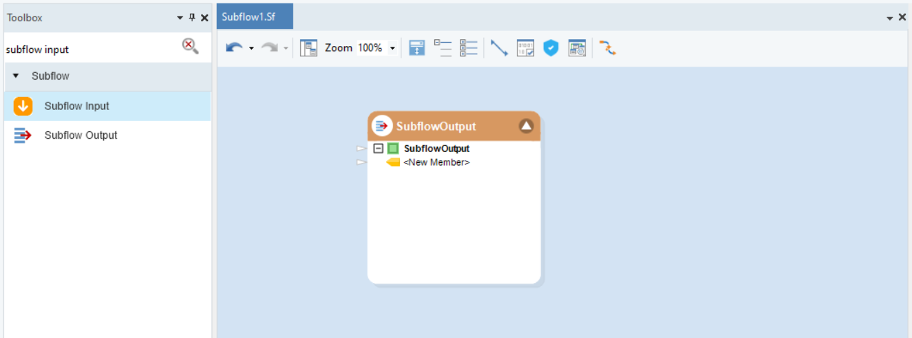 When a Subflow tab is active, the flow Toolbox has an additional group labeled Subflow. This group has two objects that control the input and output properties of your subflow.