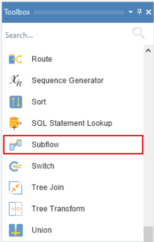 To add a *Subflow* transformation object, drag the *Subflow* object from the Transformations section in the Toolbox and drop it on to the dataflow designer.