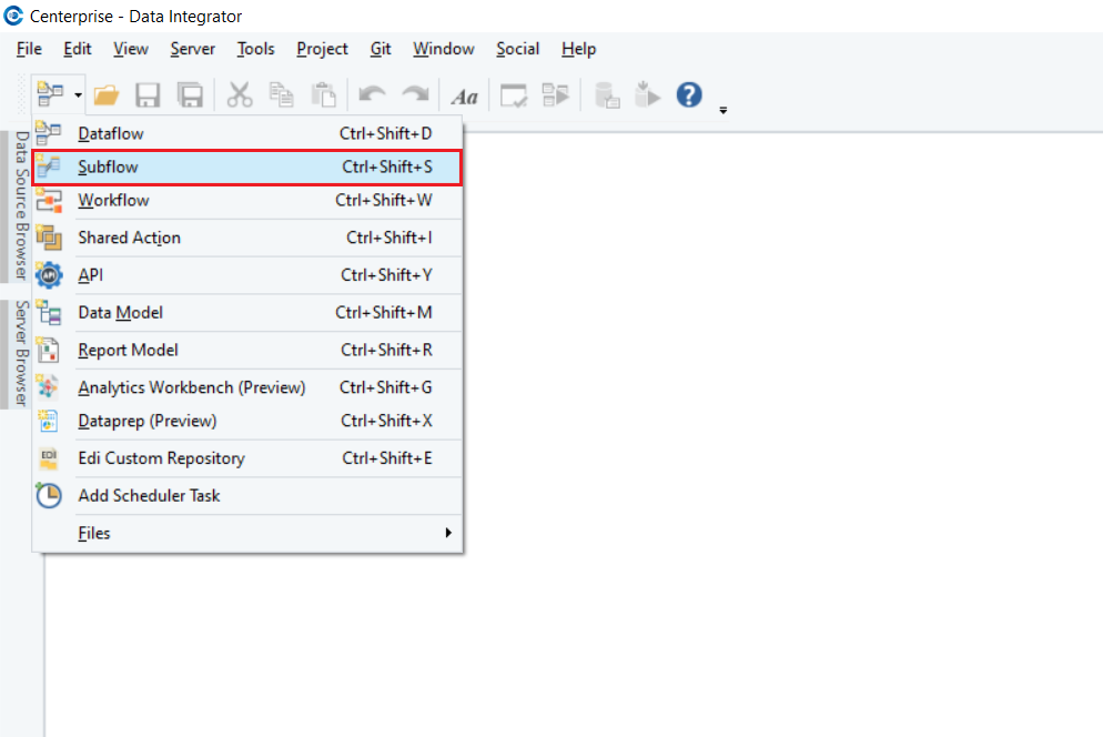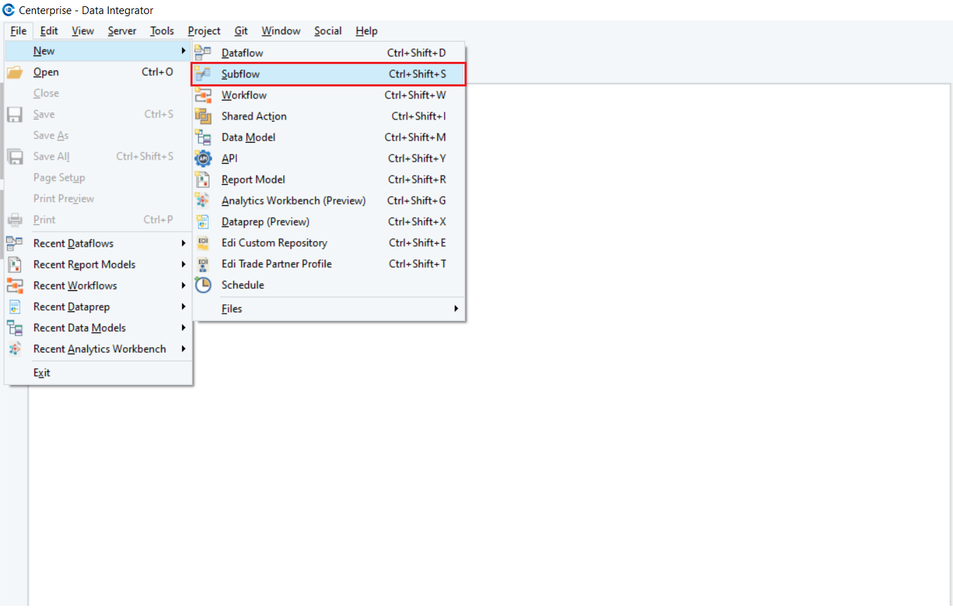 To create a new *Subflow*, go to *File > New > Subflow* on the main menu.