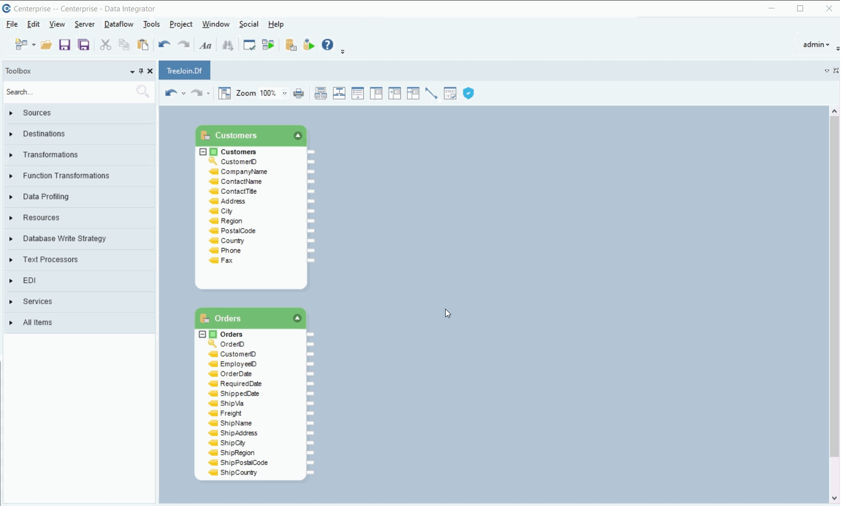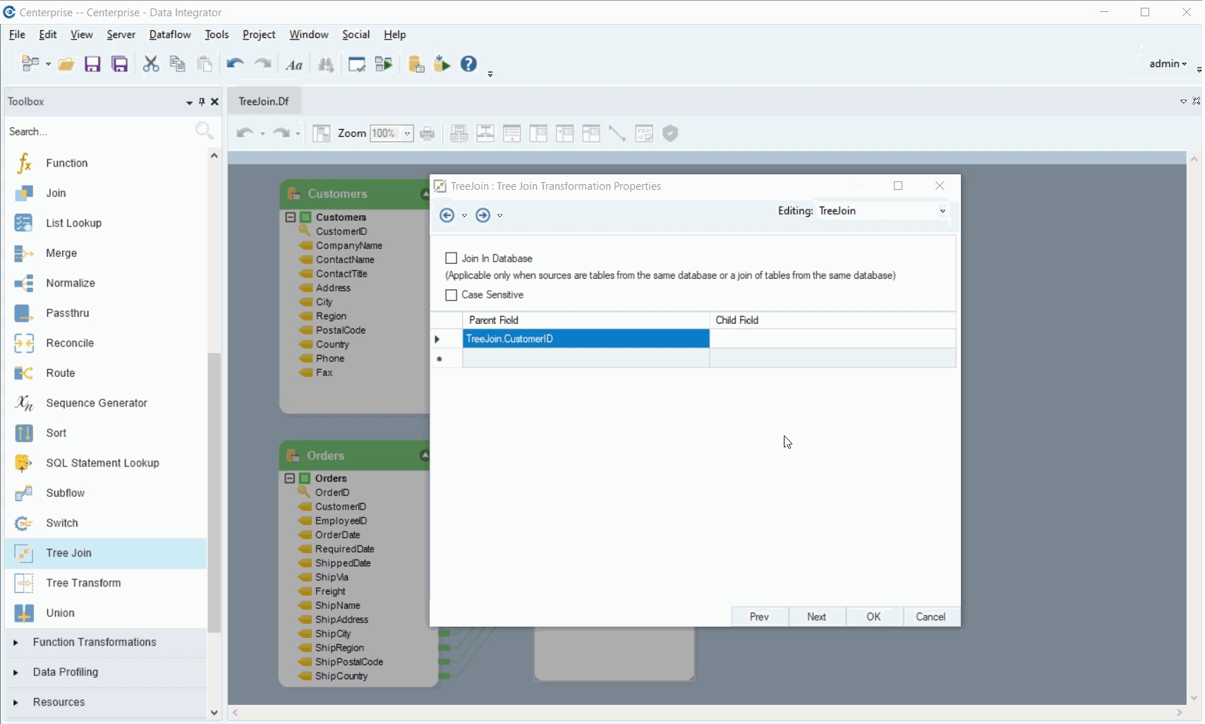 We will join these two datasets using the Tree Join Transformation object and create a hierarchical dataset in which all orders placed by a customer along with the order details are represented in a parent-child hierarchy.