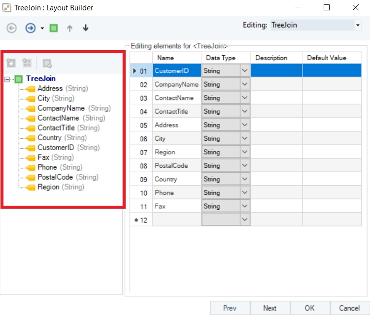 3. Right-click on the Tree Join object header and go to Properties from the context menu. In the Tree Join Layout Builder window, you can see the fields from the Customer dataset listed under the root node.