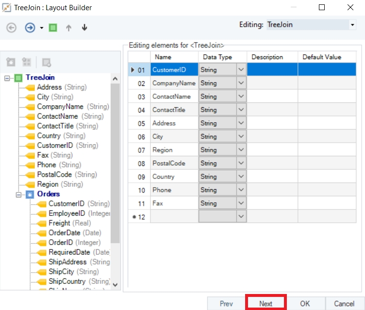 7. Go to the properties of the TreeJoin object again. We have already created the layout, so we will proceed to the next window.