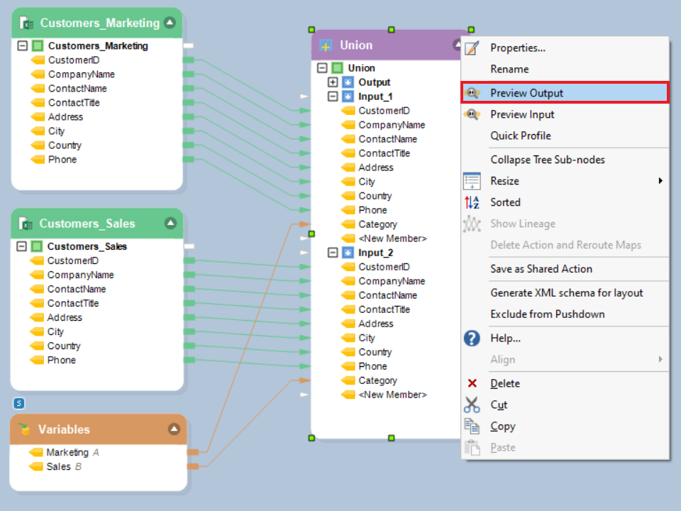 7. Right-click on the *Union* Transformation object’s header and select *Preview Output*.