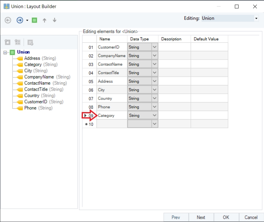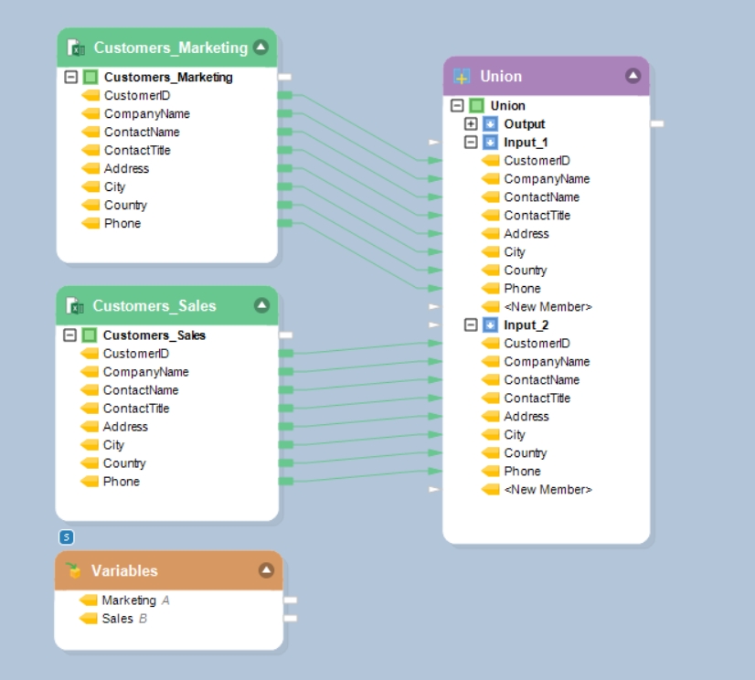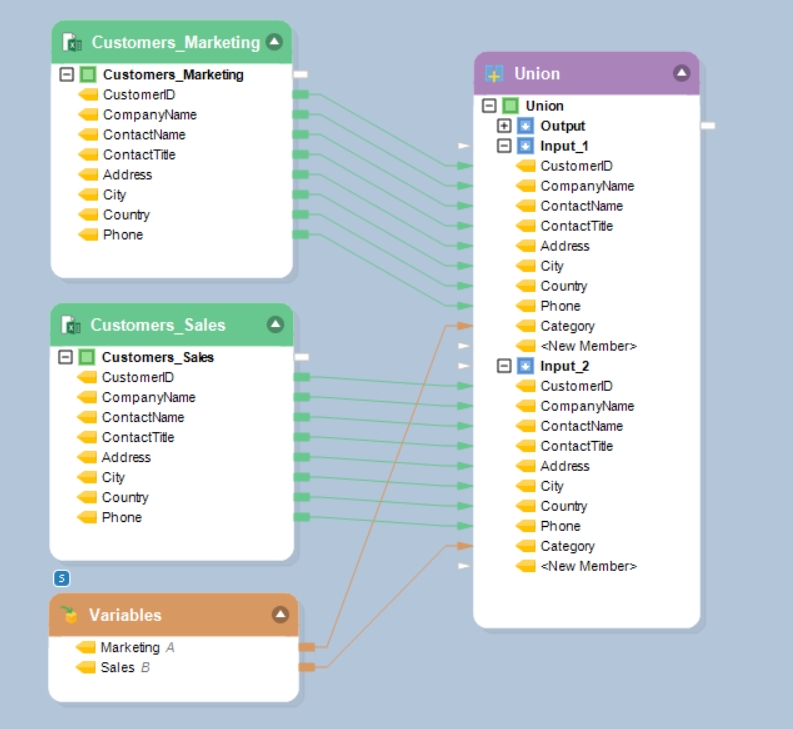 In this example, we have a customers data from two different departments: Sales and Marketing, stored in two separate Excel Workbook Source files. We want to combine this data into a single dataset using a Union Transformation object. To keep track of records coming in from each department, we will also add a new field, Category, in the layout of the Union Transformation object and pass the value using a Variables object.