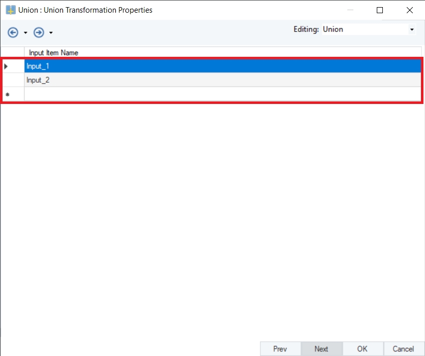 Next is the Union Transformation Properties window where there are two input nodes defined as Input_1 and Input_2 by default. You can also rename them if you want. You can also define any number of input nodes based on the number of datasets you want to combine using the Union Transformation object.