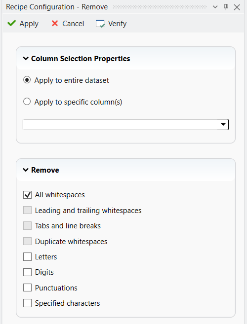 5. Alternatively, you can right-click on a column in the Grid and go to *Cleanse > Remove*. The same configuration panel will appear with the column already selected. Make any changes you need and click *Apply* to clean the data.