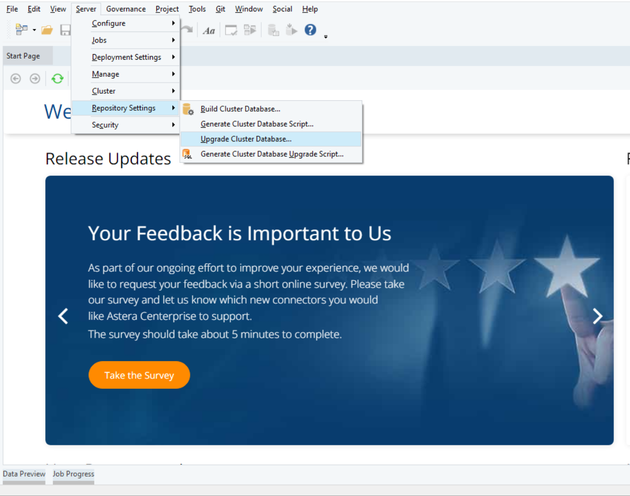In case you are installing the same version on the different machine, this option does not make any changes to the repository, it only associates your existing repository with the new Server. In case of version upgrade, the option adds new tables and columns to your existing repository, making it compatible with the new version, keeping all your previous data intact. In both cases, migration and upgradation, with the Upgrade Cluster Database option, all the jobs scheduled in the existing server will appear in the new Server after the configuration. &#x20;