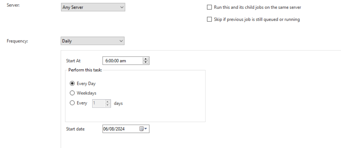 A simple way is to create 24/n distinct schedules, configured at either a Daily frequency or Once frequency, depending on the requirement. For example, if you want a job to run every 6 hours daily, you will create 4 schedules to run on a Daily frequency. The Start At time will be set at 00:00, 06:00, 12:00, 18:00 respectively for the 4 schedules.