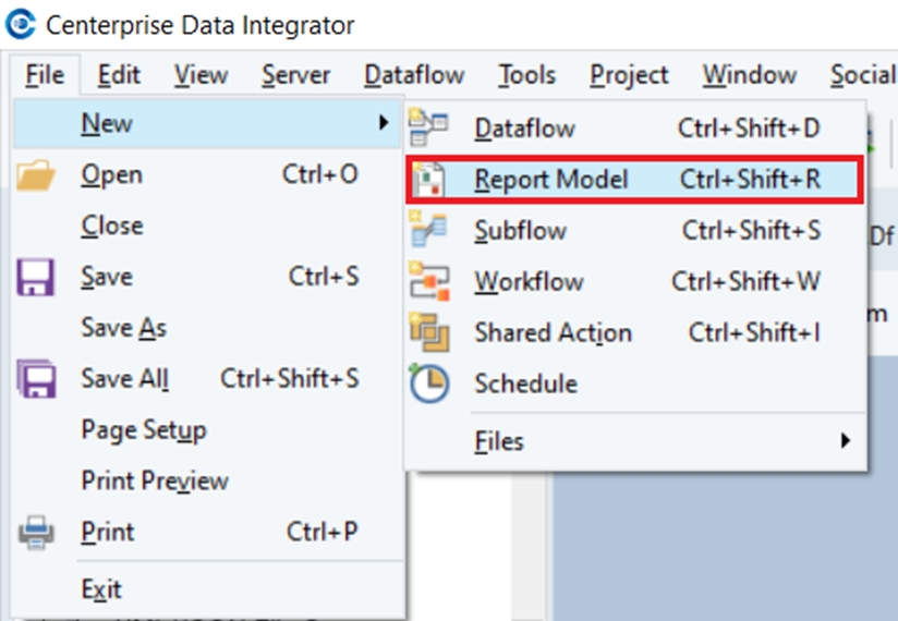To open a Report Model, go to the menu bar and select File > New > Report Model.
