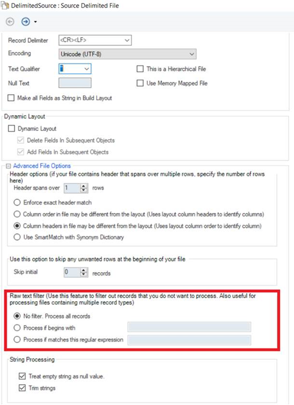 The Raw Text Filter option is available in the [*Fixed Length* *File Source*](https://documentation.astera.com/dataflows/sources/fixed-length-file-source) and [*Delimited File* *Source*](https://documentation.astera.com/dataflows/sources/delimited-file-source) properties.