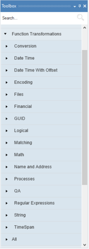 The Function Transformation functionality in Astera Data Stack is used to perform various data manipulation transformations, wherein Function Transformation objects are used to transform data based on certain logic. Astera Data Stack has a library of 290+ built-in functions which can be accessed from the Function Transformations section in the Toolbox.