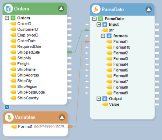 In this example, we will map this field to the string input of the function transformation object. We will also pass a specific date time format, to match the date format of the ShippedDate field, to the Format1 field in the function transformation object using a Variables object.