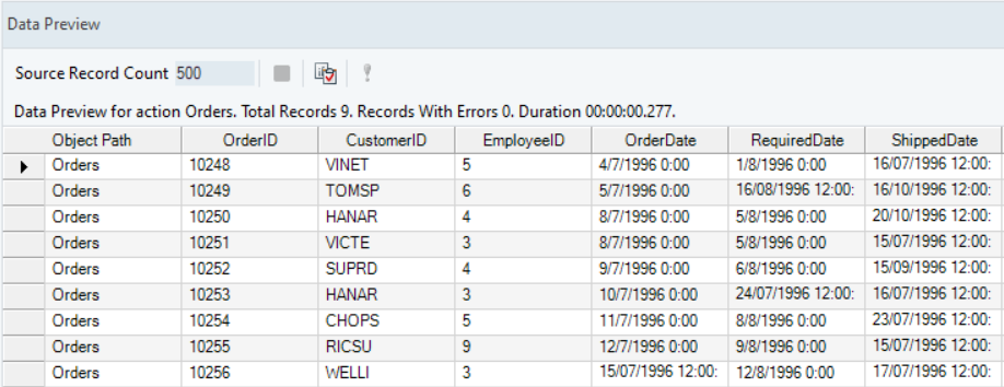 In the output window, you can see values from the ShippedDate field have been successfully parsed by the function transformation object, as the provided date time format has been matched.