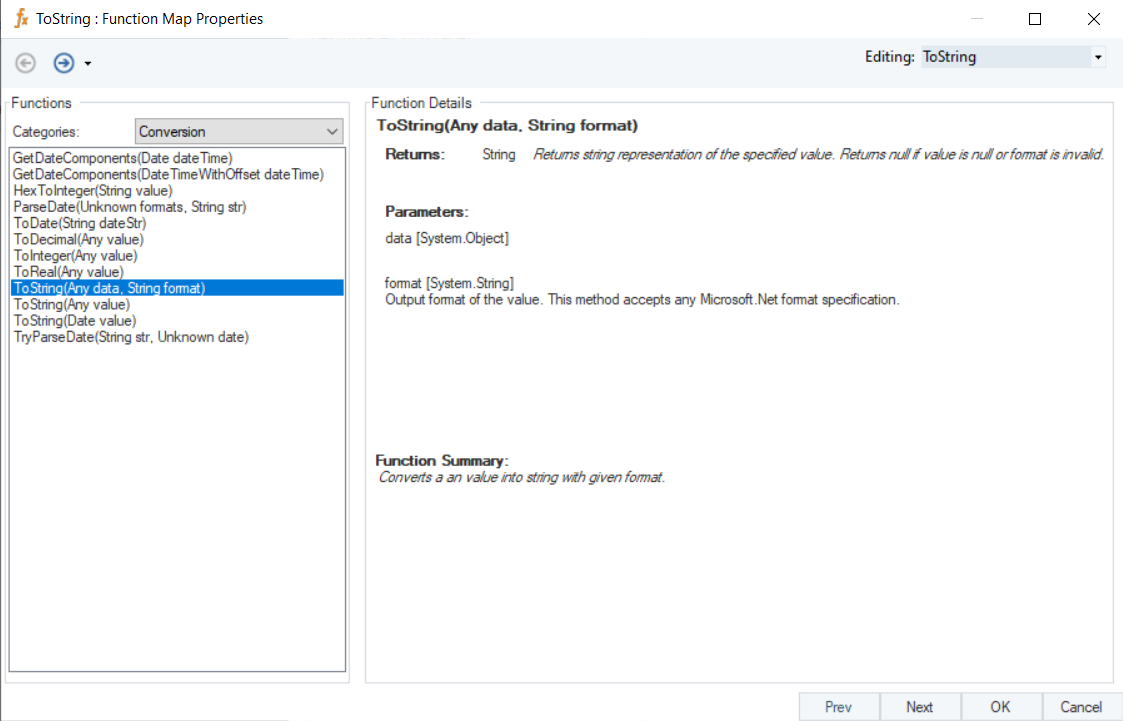 In this example we will attempt to convert the real values in this field to string values representing currency. We will map the Freight field to the data field of the function transformation object.