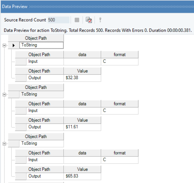 In the output window, you can see that the provided data from the Freight field has been converted to a string representing currency.