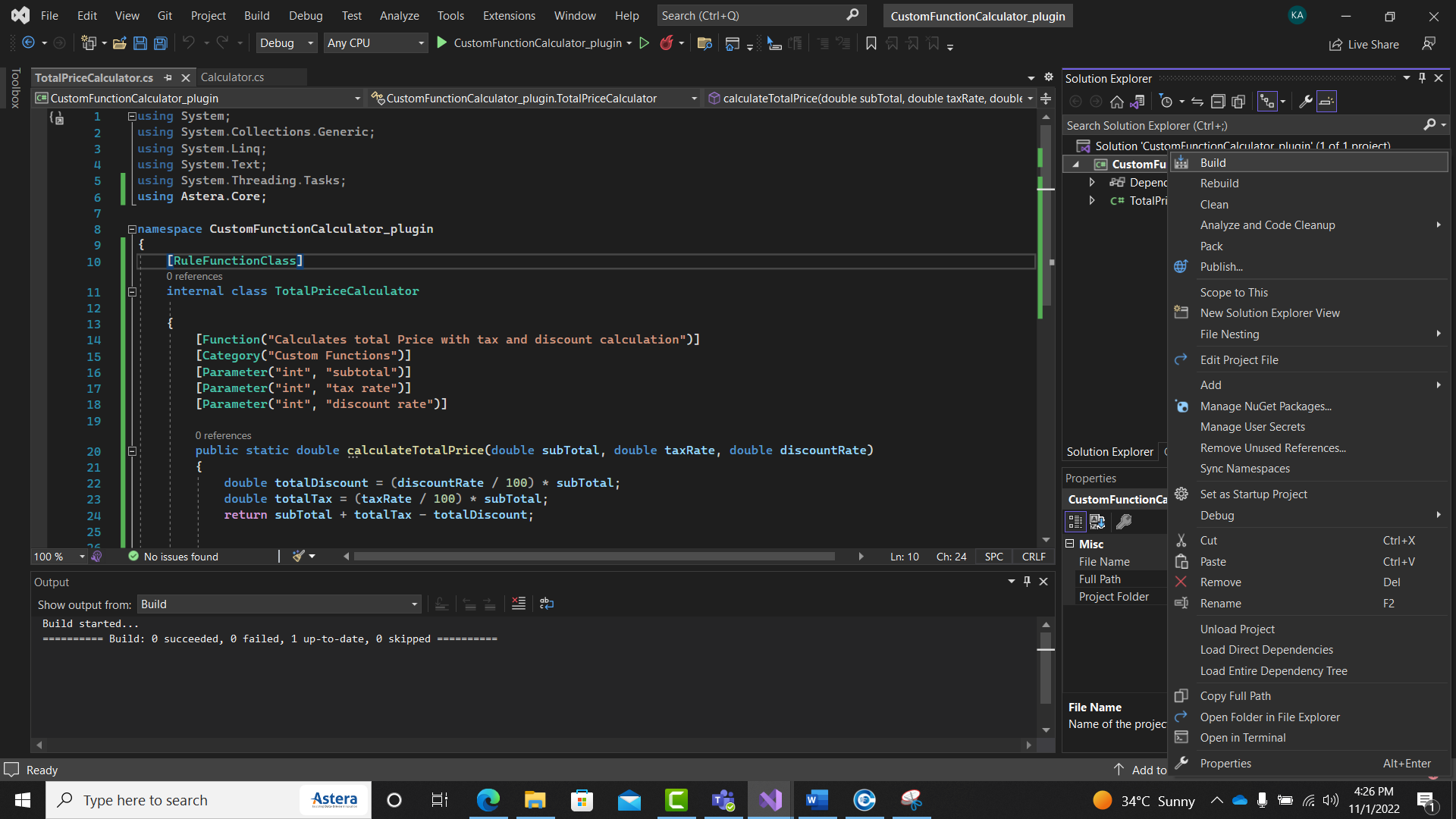 Now, we will compile our custom function. To do this we will right-click on our project and select Build from the drop-down menu.
