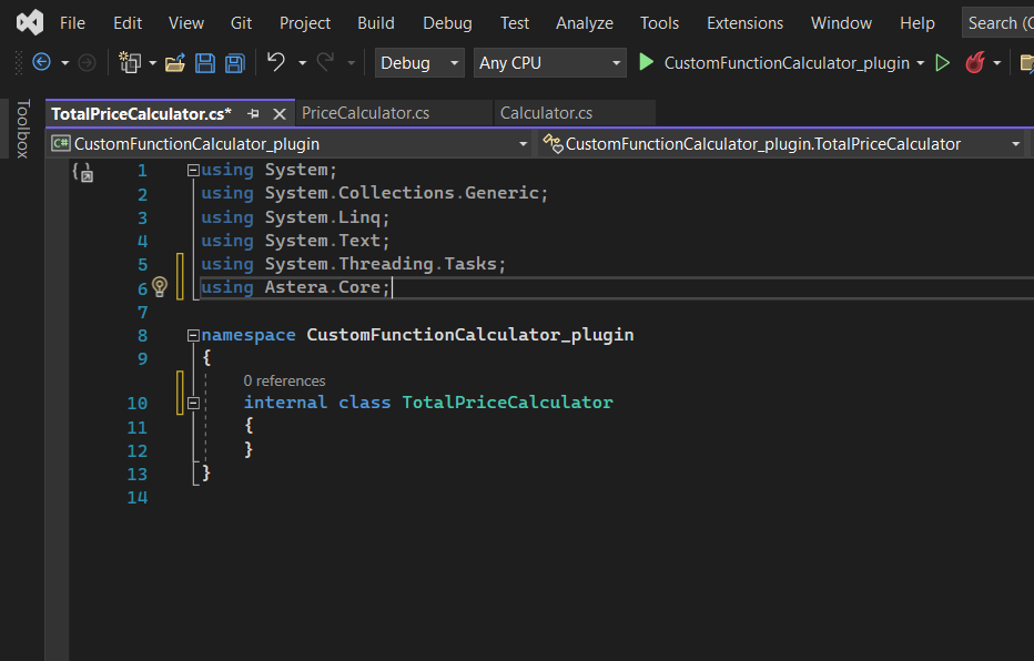 Next, we will create a new class in our project. We will name it TotalPriceCalculator. Here, we will be writing our code for the custom function that we want to create and deploy.