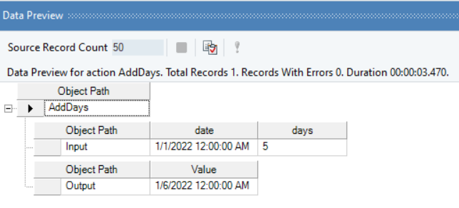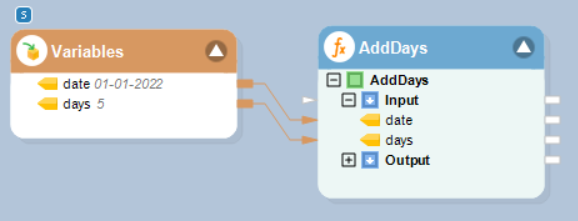 In this example, we will pass a date time value, and an integer value (indicating days to be added or subtracted) to the function transformation object using a Variables object.