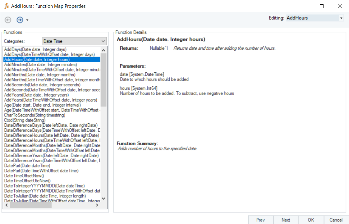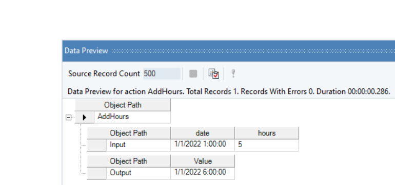 In this example, we will pass a date time value, and an integer value (indicating hours to be added or subtracted) to the function transformation object using a Variables object.